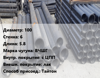 Труба чугунная 100 s=6 L=5.8 Чугун:ВЧШГ с ЦПП *лак Тайтон, шт цена от 820.62 ₽ / шт, где купить, условия доставки в Тюмени и Тюменской области