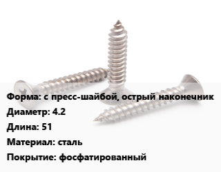 Саморез с пресс-шайбой, острый наконечник D=4.2 L=51 сталь фосфатированный, шт цена от 2.61 ₽ / кг, где купить, условия доставки в Тюмени и Тюменской области