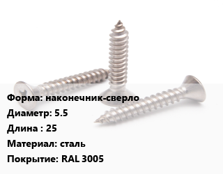 Саморез наконечник-сверло D=5.5 L=25 сталь RAL 3005, упаковка 420 шт цена от 1 233 ₽ / кг, где купить, условия доставки в Тюмени и Тюменской области
