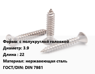 Саморез с полукруглой головкой D=3.9 L=22 нержавеющая сталь ГОСТ: DIN 7981