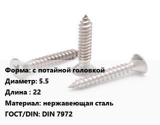 Саморез с потайной головкой D=5.5 L=22 нержавеющая сталь ГОСТ: DIN 7972