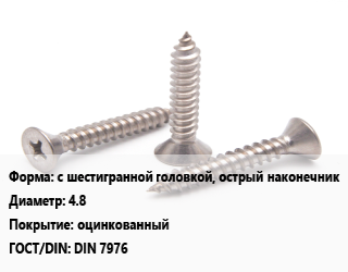 Саморез с шестигранной головкой, острый наконечник D=4.8 оцинкованный ГОСТ: DIN 7976