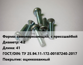 Винт самонарезающий, с прессшайбой 4.2х41 ТУ 25.94.11-172-00187240-2017 оцинкованный