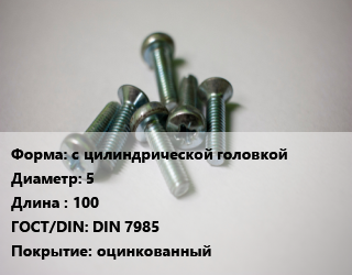 Винт с цилиндрической головкой 5х100 DIN 7985 оцинкованный, цена за шт, кг цена от 16.27 ₽ / кг, где купить, условия доставки в Тюмени и Тюменской области