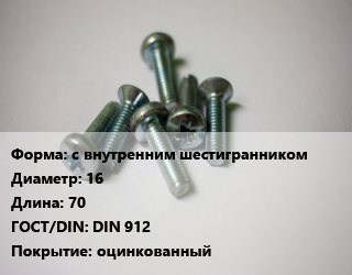 Винт с внутренним шестигранником 16х70 DIN 912 оцинкованный, 10.9,12.9,8.8, Китай,цена за шт, кг цена от 227.57 ₽ / кг, где купить, условия доставки в Тюмени и Тюменской области