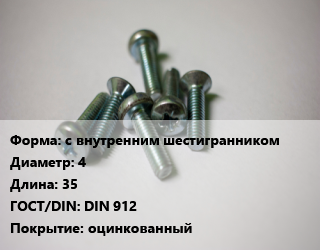 Винт с внутренним шестигранником 4х35 DIN 912 оцинкованный, 8.8, Китай,цена за шт, кг цена от 622.58 ₽ / кг, где купить, условия доставки в Тюмени и Тюменской области