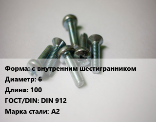 Винт с внутренним шестигранником 6х100 DIN 912 Сталь: A2, цена за шт, кг цена от 62.1 ₽ / кг, где купить, условия доставки в Тюмени и Тюменской области