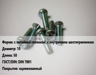 Винт с потайной головкой, с внутренним шестигранником 10х50 DIN 7991 оцинкованный, 8.8, цена за шт, кг цена от 14.96 ₽ / кг, где купить, условия доставки в Тюмени и Тюменской области