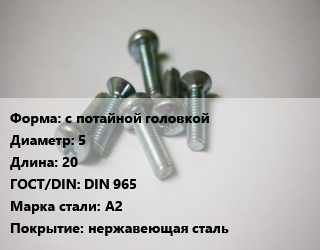 Винт с потайной головкой 5х20 DIN 965 Сталь: А2 нержавеющая сталь, цена за шт, кг цена от 5.67 ₽ / кг, где купить, условия доставки в Тюмени и Тюменской области