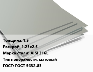Лист нержавеющий 1.5 1.25х2.5 Сталь: AISI 316L Тип:матовый ГОСТ 5632-83, шт, х/к цена от 23 129 ₽ / т, где купить, условия доставки в Тюмени и Тюменской области